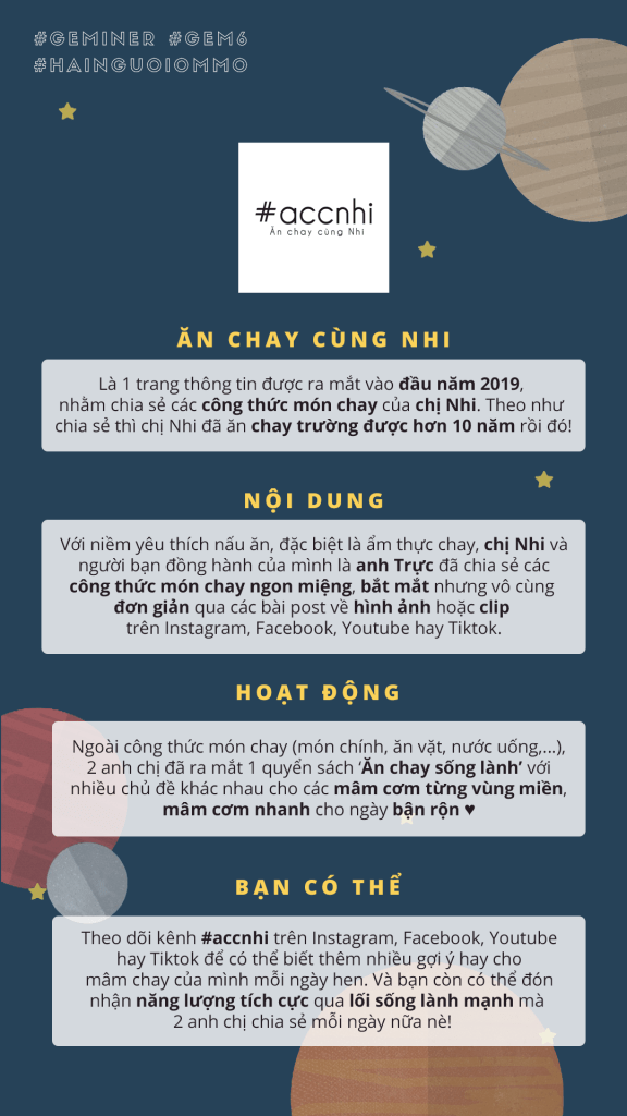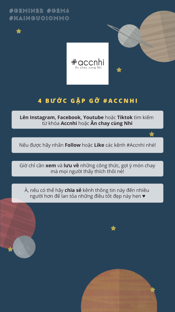 Mọi người có thể theo dõi kênh #accnhi trên các nền tảng mà mình liệt kê ở dưới đây để có thể biết thêm nhiều gợi ý hay cho mâm chay của mình và gia đình mỗi ngày. Ngoài ra, theo dõi 2 anh chị cũng là một cách giúp mình và chính các bạn có thêm nguồn cảm hứng và năng tích cực thông qua lối sống lành mạnh này của 2 anh chị nhé!