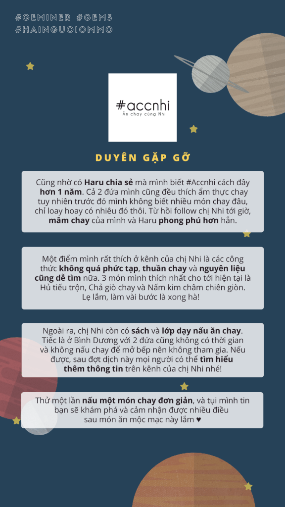 Cách đây hơn 1 năm, cũng nhờ có Haru chia sẻ mà mình biết #Accnhi. Cả 2 đứa mình cũng đều thích ẩm thực chay tuy nhiên trước đó mình không biết nhiều món chay đâu, chỉ loay hoay có nhiêu đó thôi. Và có một giai đoạn cách đây vài năm, mình cũng đã thử ăn chay trường nhưng không thành công lắm vì chủ yếu mua đồ ăn nấu sẵn về. May mắn là từ khi follow chị Nhi tới giờ, mâm chay của mình và Haru phong phú hơn hẳn.