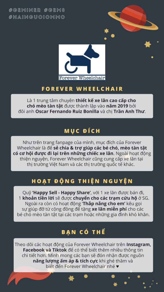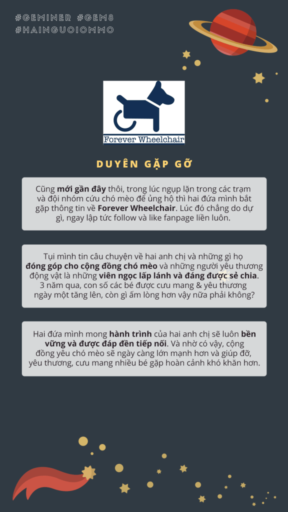 Cũng mới gần đây thôi, trong lúc ngụp lặn trong các trạm và đội nhóm cứu chó mèo để hủng hộ thì 2 đứa mình bắt gặp thông tin về Forever Wheelchair. Lúc đó chẳng do dự gì, ngay lập tức follow và like fanpage liền luôn.