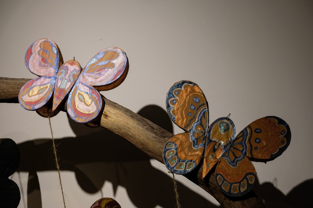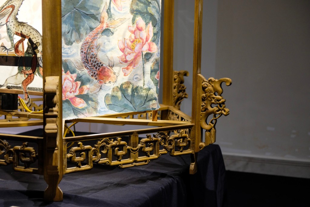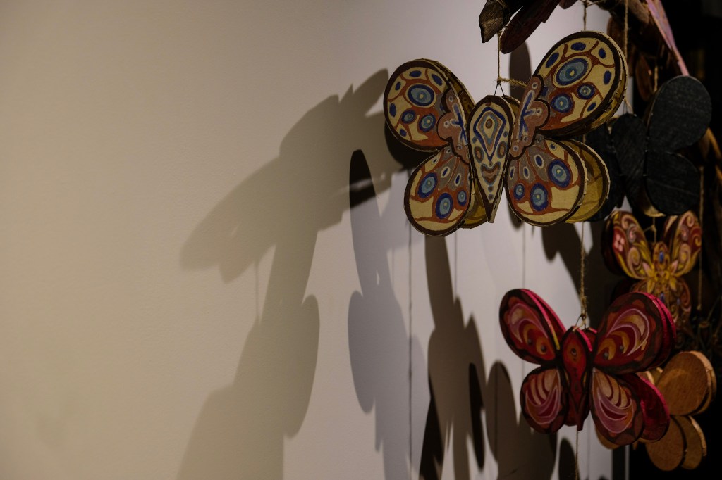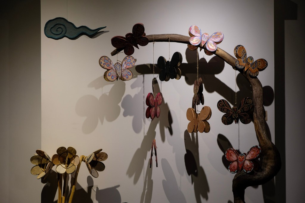 Tụi mình thấy hai chiếc lồng đèn bướm lớn ở khu vực trung tâm của triển lãm, cạnh đó là một chiếc đèn kéo quân với hình ảnh hoa sen, cá chép trông trăng, lồng đèn trái đào, lồng đèn trái lựu, đèn cù đơn giản mộc mạc, hay nguyên một mảng tường được lấp đầy với rất nhiều tờ giấy dó nâu, ngà và trắng tự nhiên xếp lớp cạnh nhau một cách có chủ ý.